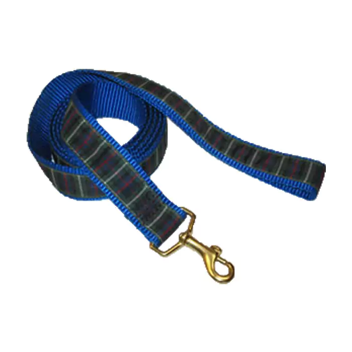 Durable nylon web dog leash with brass hardware and custom ribbon.