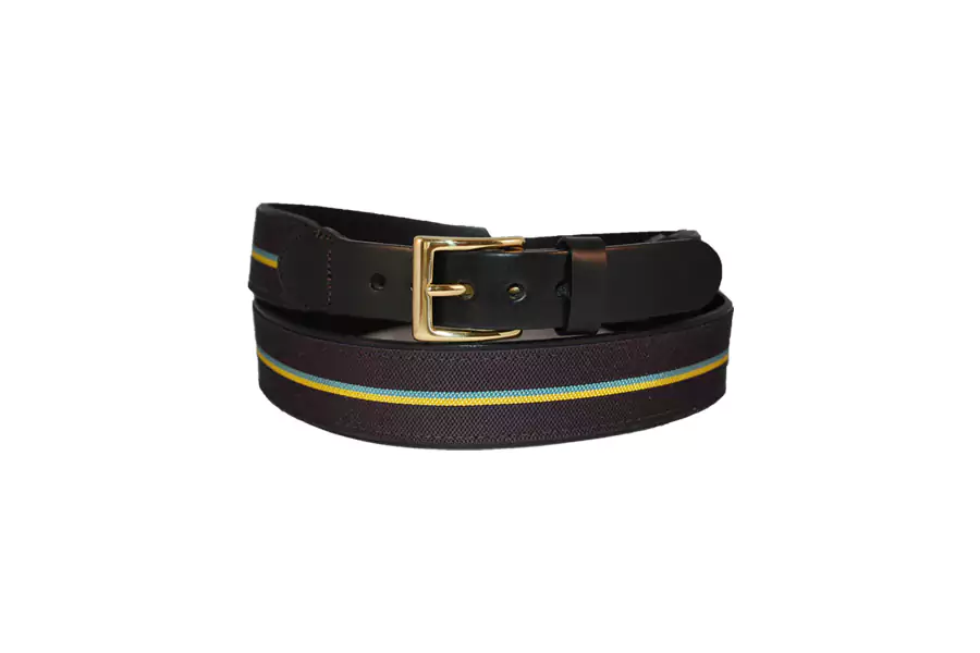 Black or brown leather backed belt with brass hardware and custom ribbon.