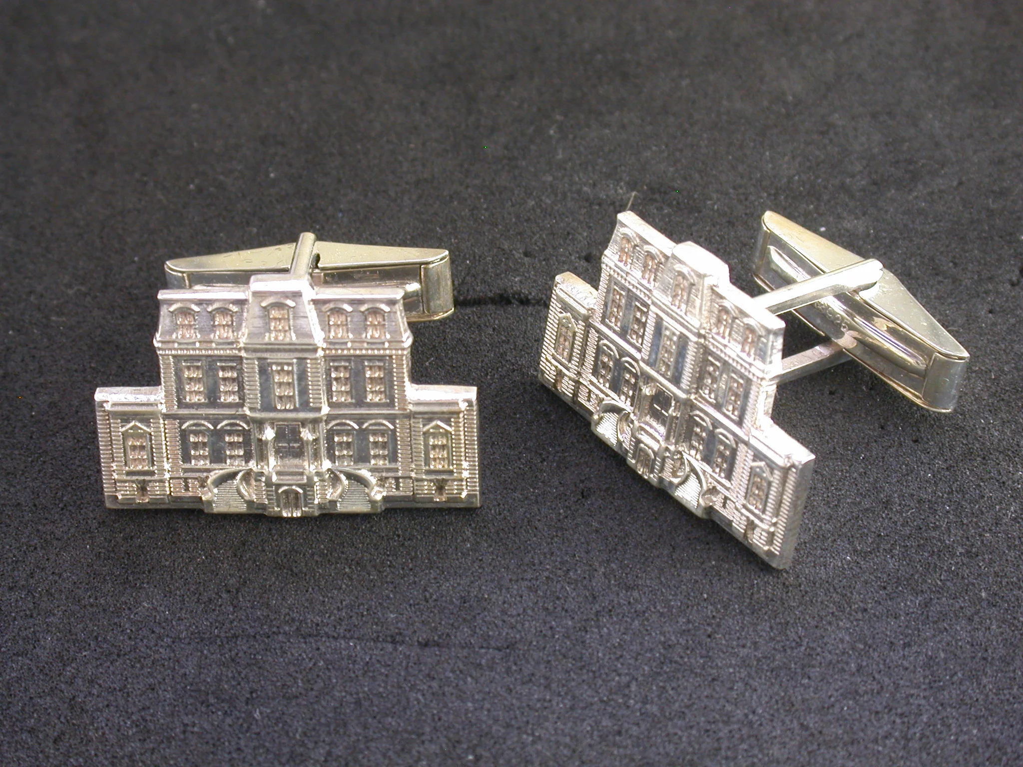 Finely made sterling silver, free standing cufflinks with exquisite attention to detail. We can craft any shape or size. Two cufflinks per set. Minimum order is 12 sets. Set up charge is $350.